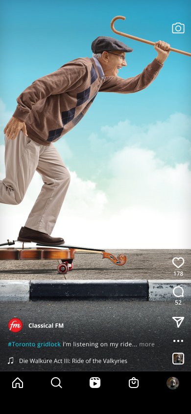 For this campaign, it was a series of outlandish image composites of people with classical instruments and the idea of classical music accompanying the thing you’re doing — be it cycling, skateboarding, scootering, or just rocking-out, amid the chaos of life.